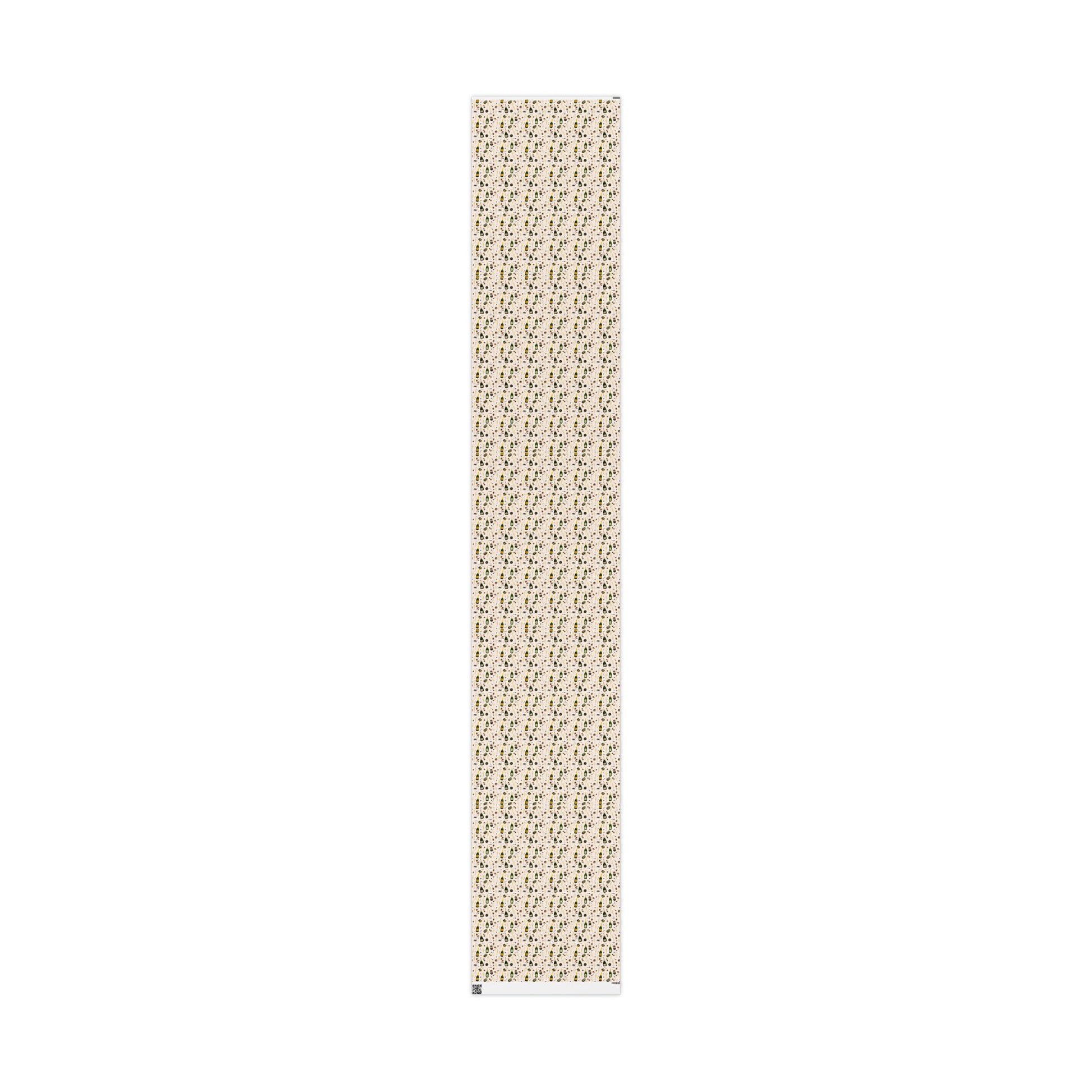 A cheerful, champagne-themed wrapping paper printed on 90 gsm fine art paper. Small, repeating illustrations of champagne bottles, flutes, bubbles and corkscrews float across a warm, creamy background—subtle and celebratory without shouting. The print is one-sided and available with either a smooth matte or glossy high-definition finish, so you can choose a soft, elegant look or a brighter, luxe sheen. Available in three roll lengths to suit small tokens or long multi-gift projects. There are narrow white trim bands at the top and bottom containing a small barcode and QR code from the printer.